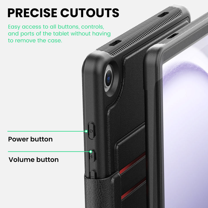 The front cover features three anti-slip grooves, allowing you to adjust your tablet to the perfect viewing or typing position. Wider cutouts ensure easy access to the camera, speakers, buttons, and ports.